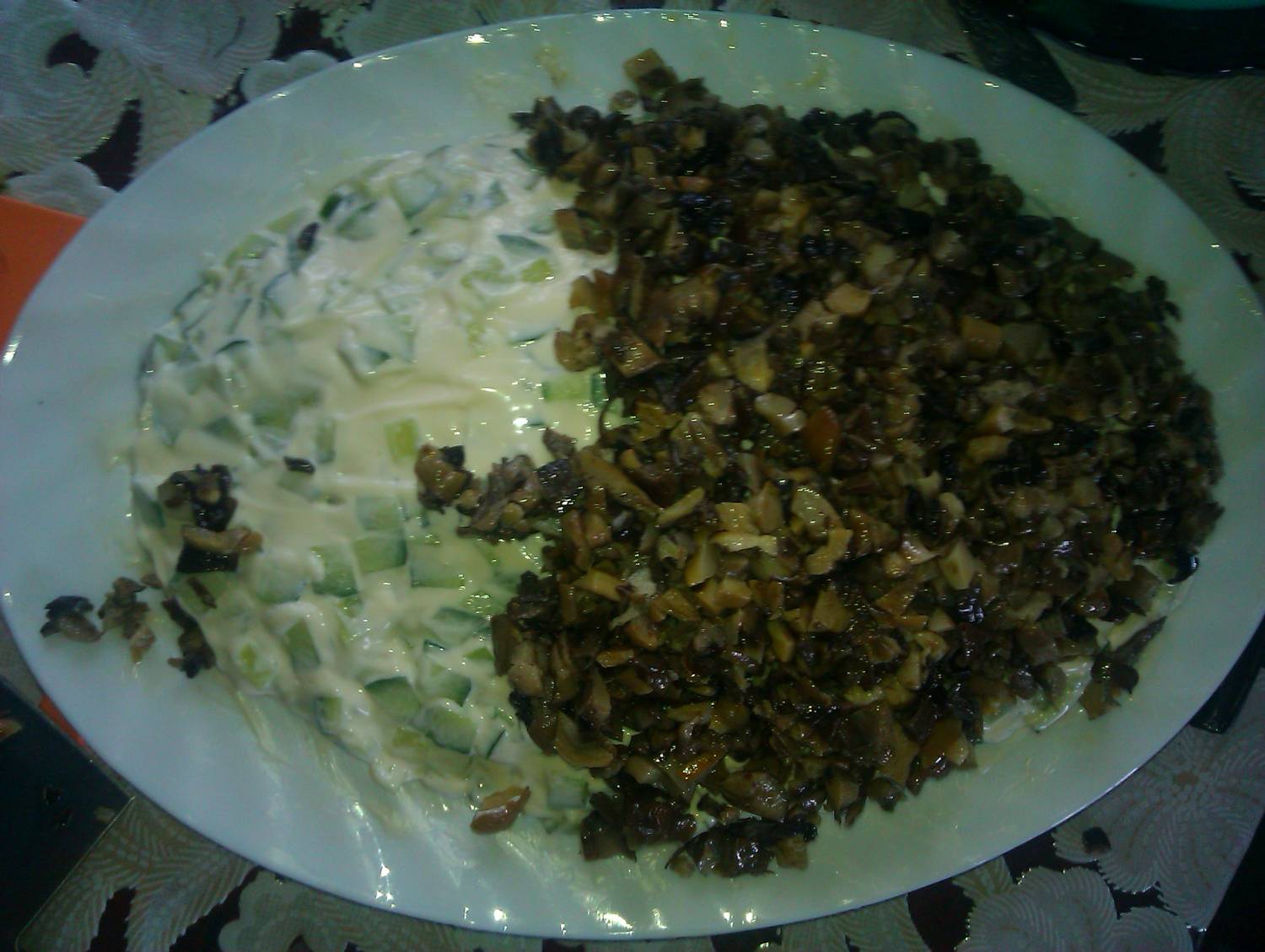 В другой кастрюле отварите 400 грамм шампиньонов. Еще нам понадобятся: свежие огурцы - 2 шт; яйцо(вареное) - 5 шт; сыр(твердый) - 100 гр; майонез; пол-головки лука; соль, перец по вкусу.