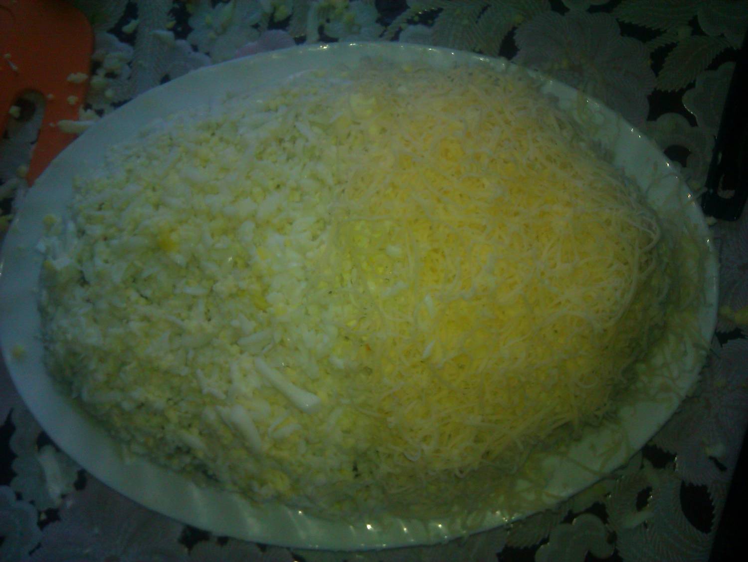 Теперь на мелкой терке трем сыр, не жалеем закрываем хорошо - это 5 слой.