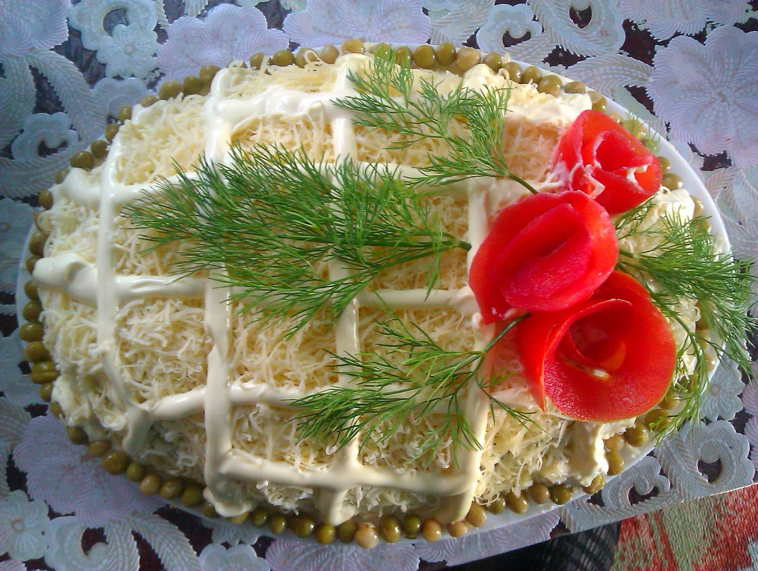 Осталось нарисовать майонезом сетку и украсить веточками укропа. Приятного аппетита! happy